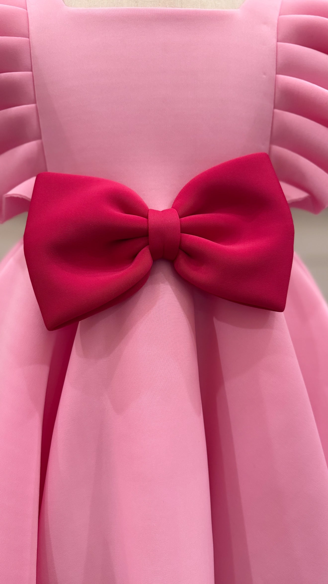 This soft pastel pink dress is the definition of grace! Featuring layered ruffle sleeves for a statement look and a bold fuchsia bow at the waist, it’s perfect for twirls and special moments. The full, flared skirt with tulle underneath adds extra volume for that princess-perfect feel. Comes with a matching hair bow to complete the dreamy look. Perfect for birthdays, parties, and making memories!