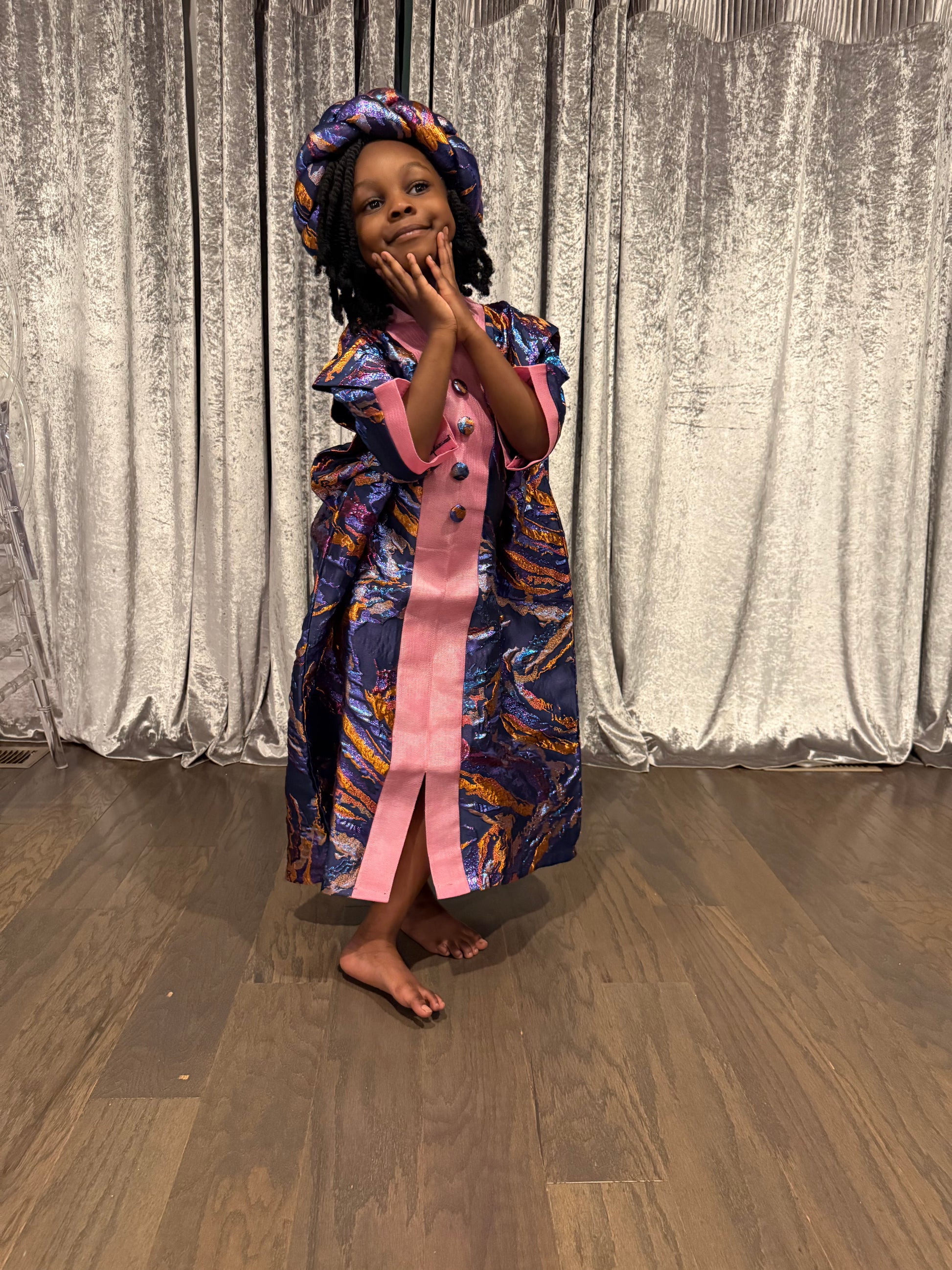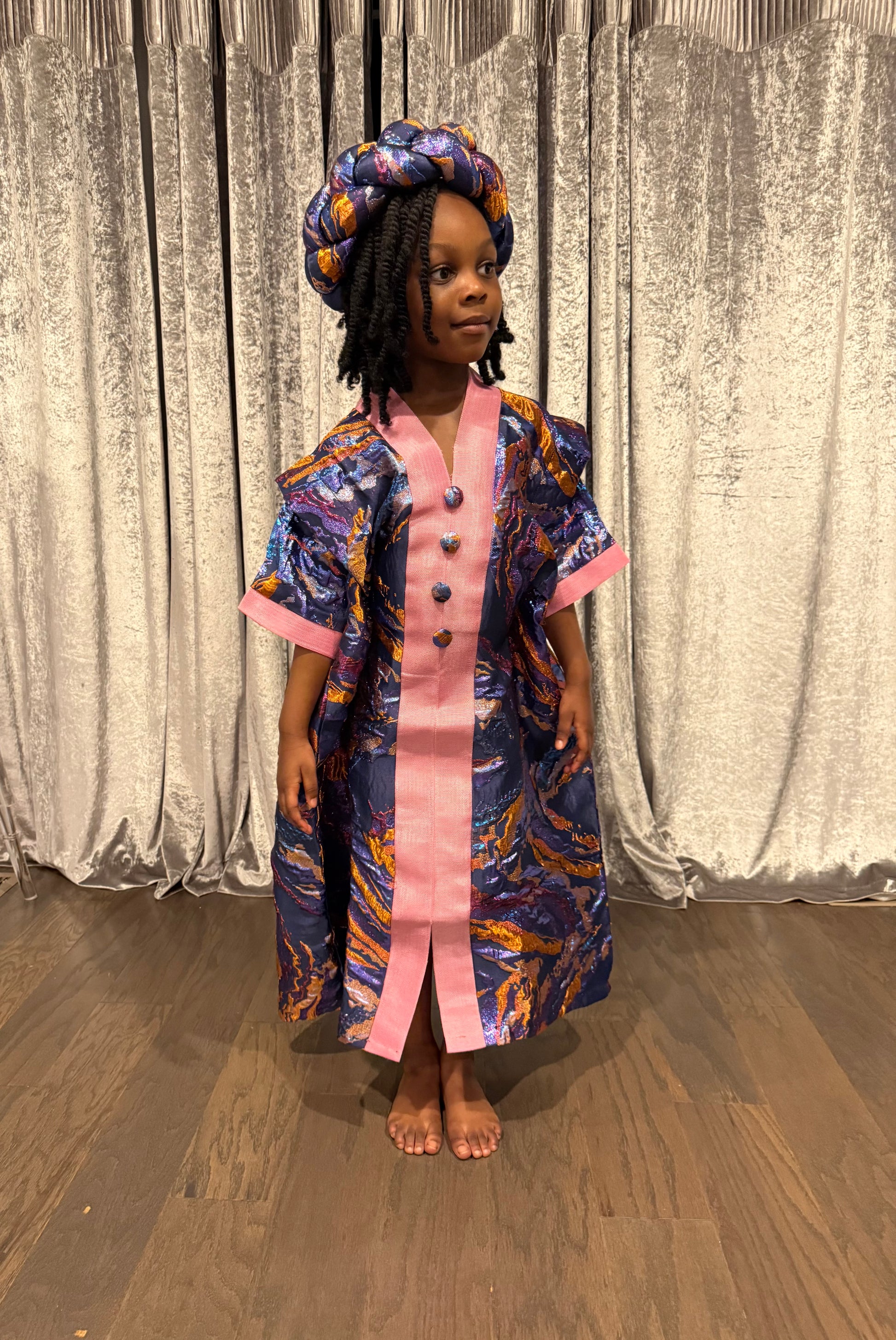 Made from luxe satin with a swirl of navy, gold, and violet, it features a structured silhouette trimmed with vibrant pink and charming front buttons. The matching headband completes the look with style and culture.