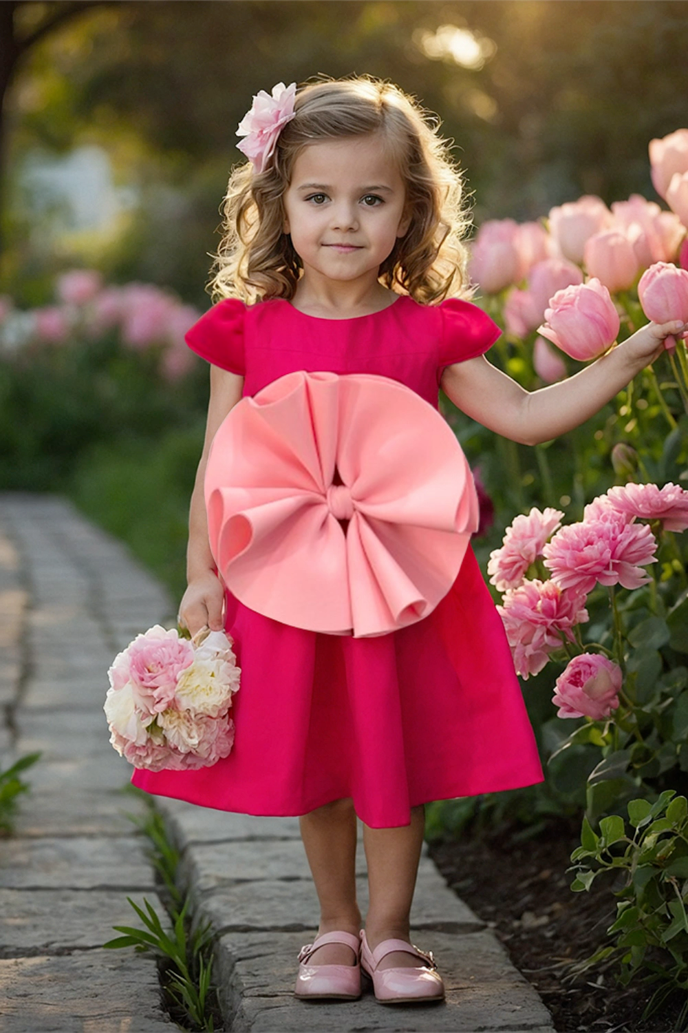 Introducing the adorable "Blossom Baby Doll Dress" designed to steal the spotlight and turn your toddler into a showstopper! This charming dress is made to suit every mood and occasion. The dress is a vibrant fuchsia pink complemented by a big statement pink floral bow tie in the front. It's not just an accessory; it's the focal point that adds a playful and trendy vibe to your little one's look.