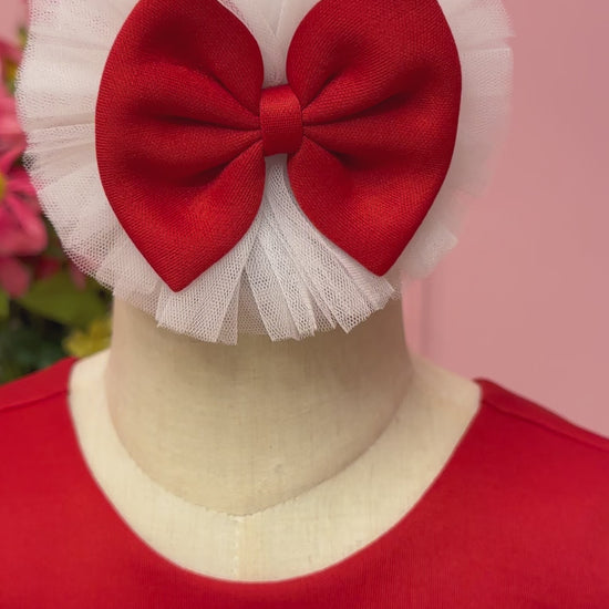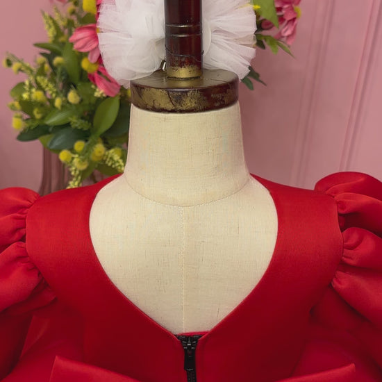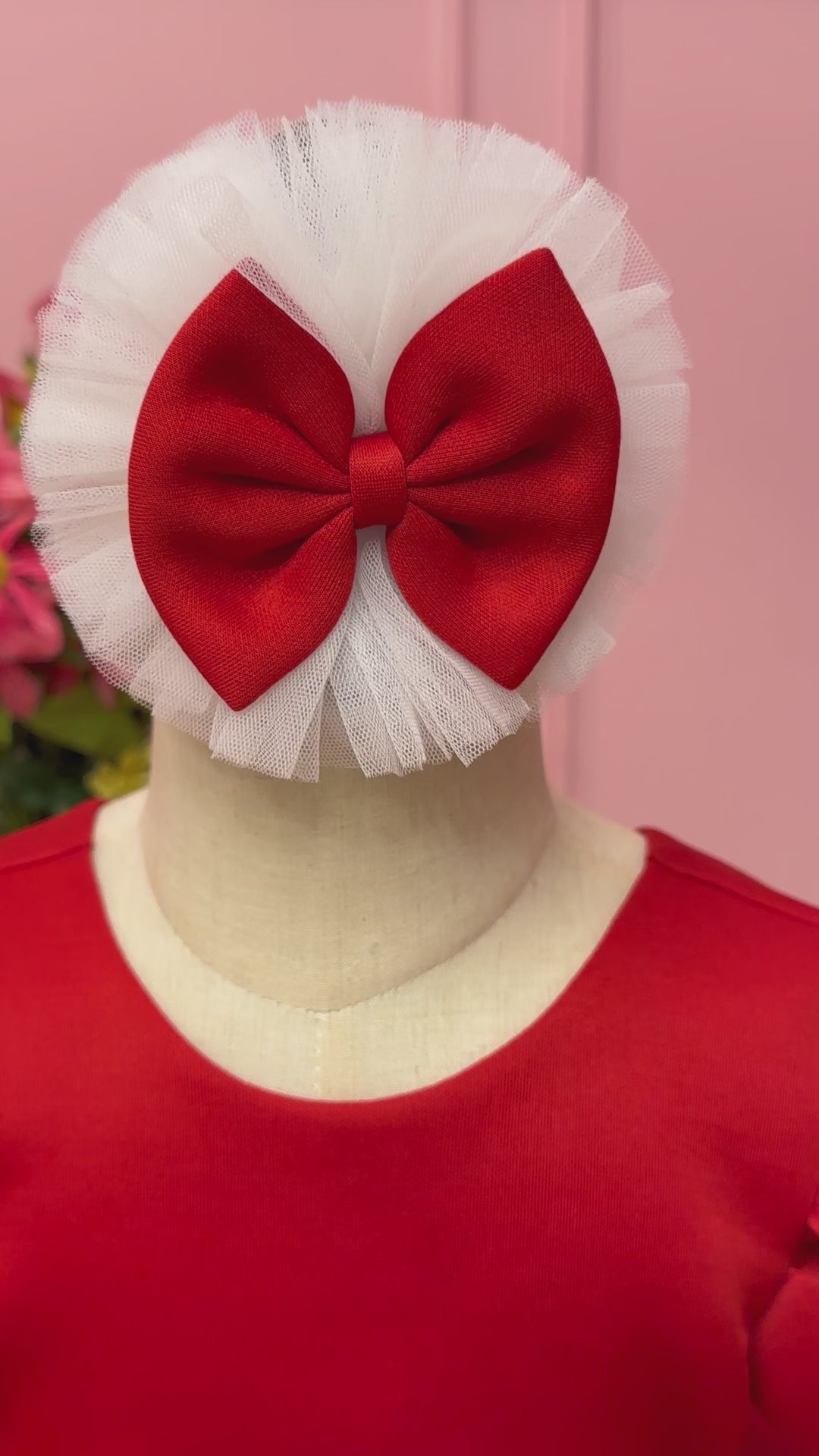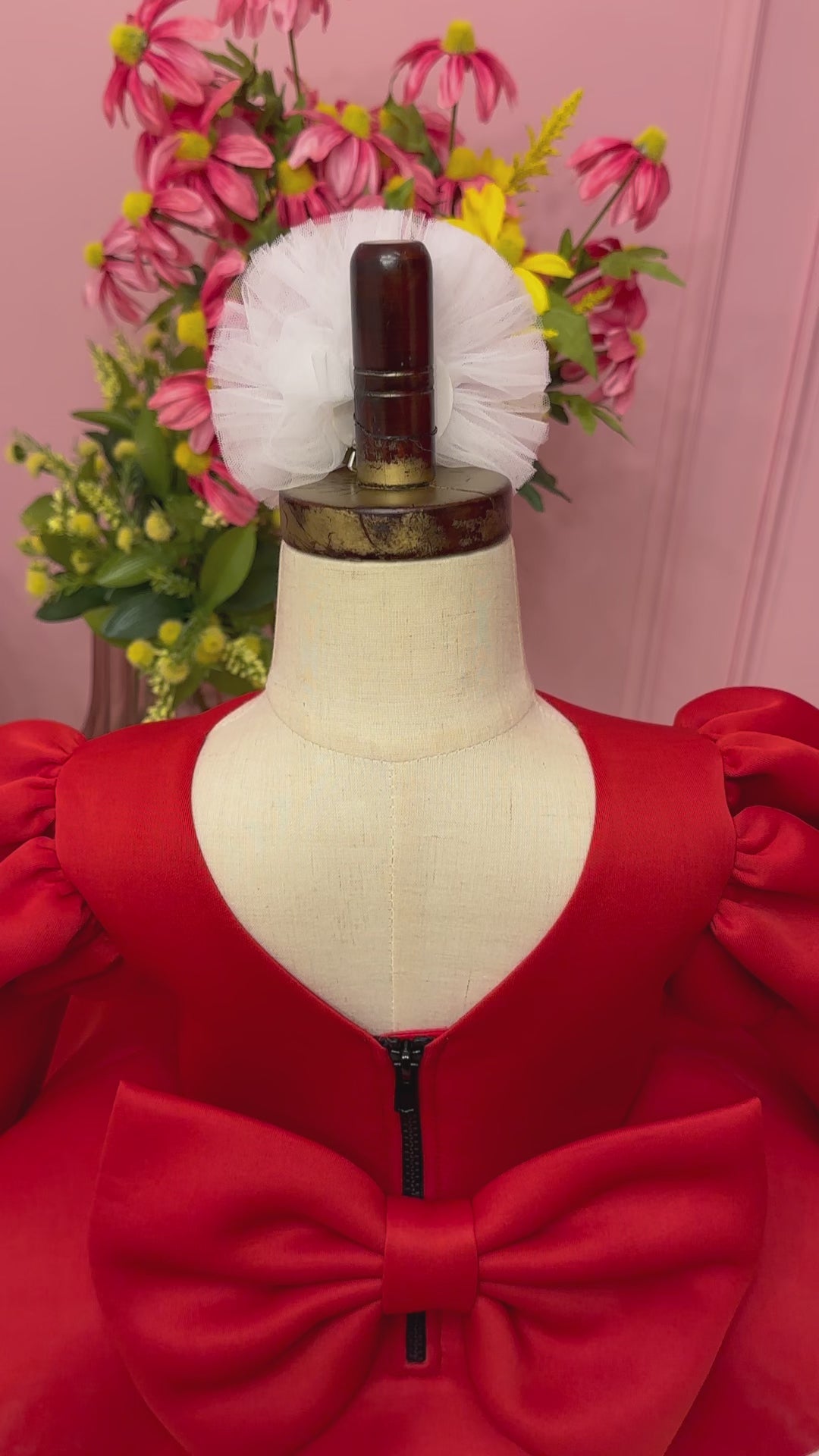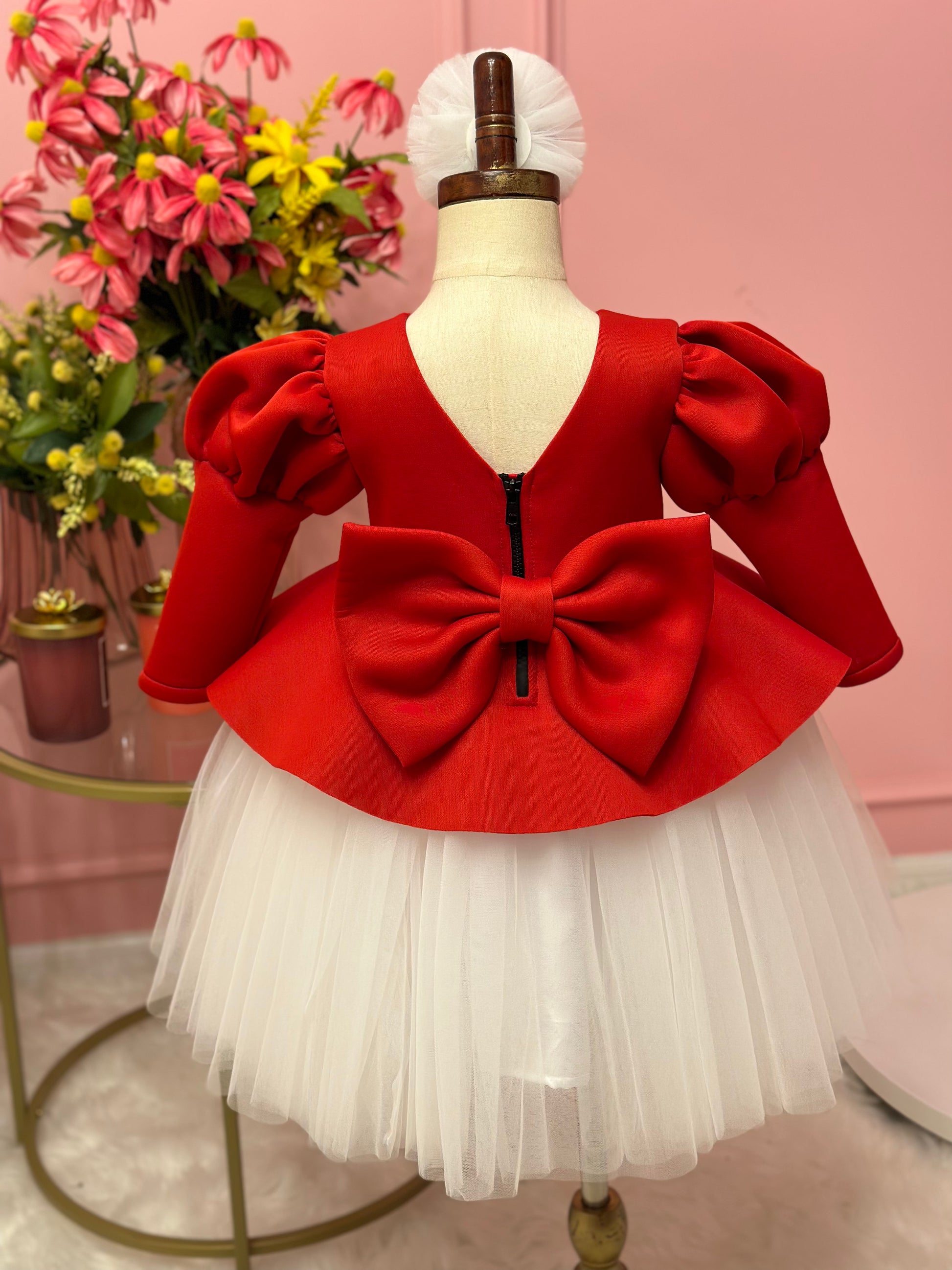 The red bodice features puff sleeves and a statement bow at the back, adding a touch of royal charm. The layered white tulle skirt blooms into a soft, voluminous silhouette that moves beautifully with every twirl — capturing the joy and wonder of the festive season. Complete her magical look with the matching head bow for an unforgettable holiday ensemble.