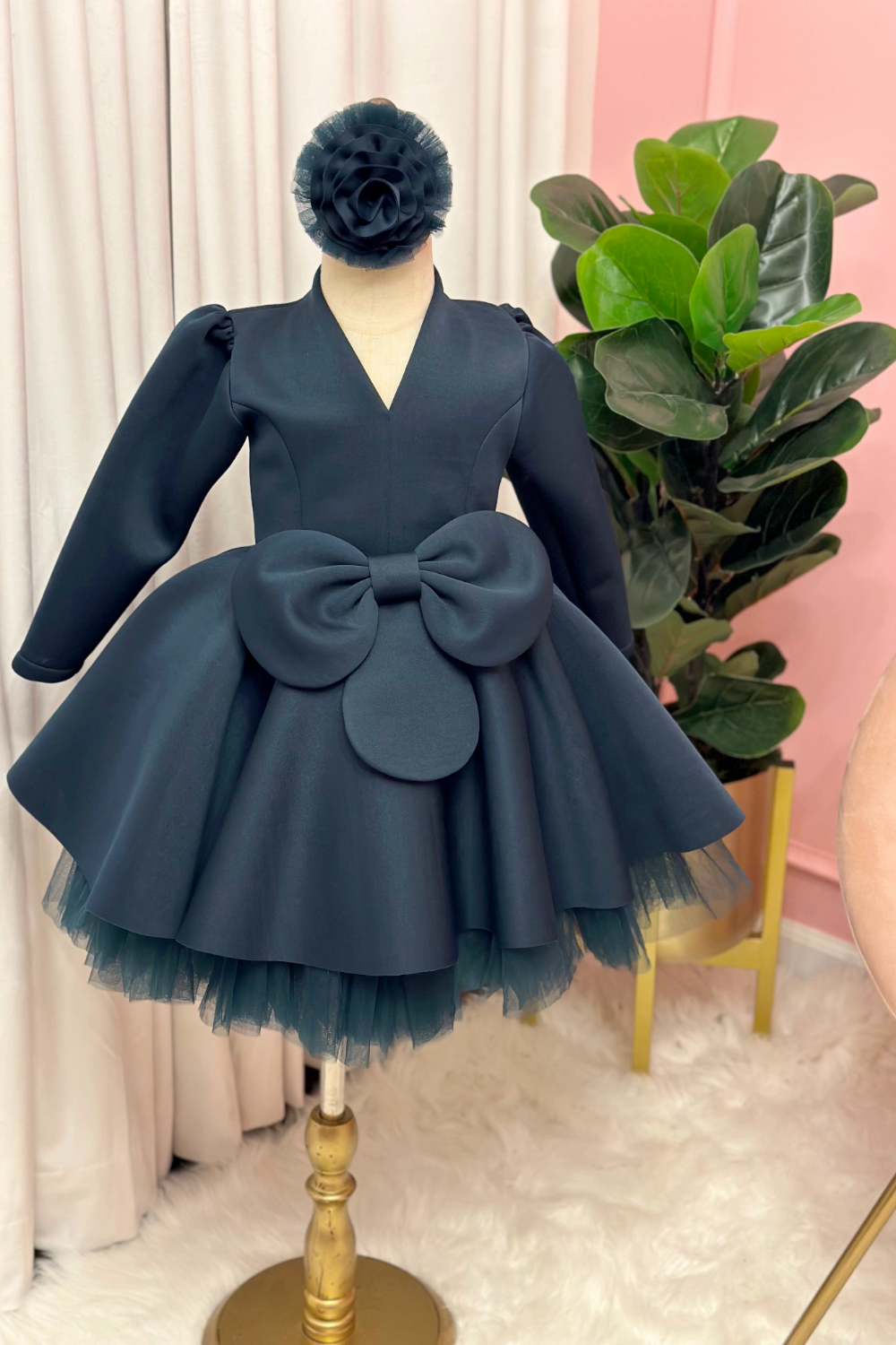 The fitted bodice and long puff sleeves create a regal silhouette, while the layered tulle skirt adds soft volume for that picture-perfect twirl. A chic waist bow completes the look, and the matching head bow ensures your little fashion star turns heads wherever she goes.