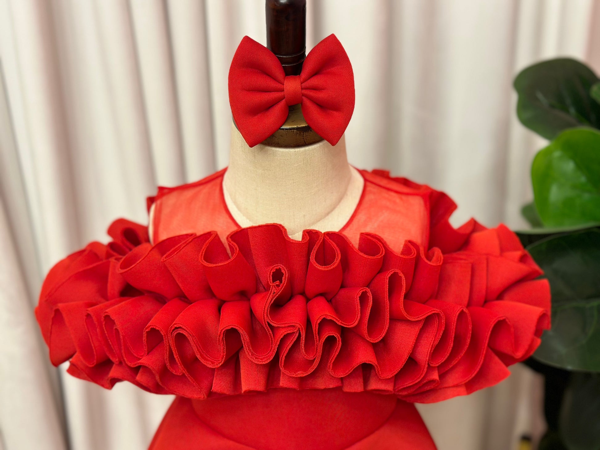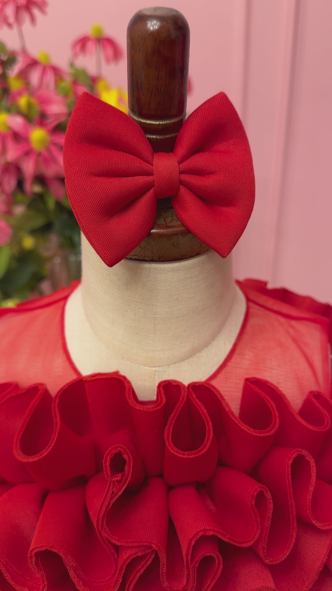 The red base is adorned with soft ruffled layers across the bodice, creating a whimsical, textured finish that brings the dress to life. The sheer yoke with an O-neckline and sleeveless shoulders ensures comfort and breathability, while the A-line silhouette flows gracefully — perfect for twirling through magical holiday moments. Complete her festive look with the matching hair bow for a polished, picture-perfect finish.