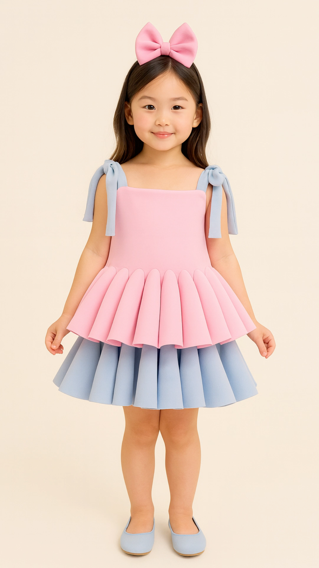 This pink and baby blue beauty is a dream come true! Designed with double-layered pleated ruffles, it creates a stunning, voluminous look that’s perfect for twirling. The soft tie straps add a playful, delicate touch, making it both elegant and fun. Made from premium neoprene, it’s comfortable yet stylish for any special occasion. Comes with a matching hair bow for the perfect finishing touch. A must-have for your little fashionista!